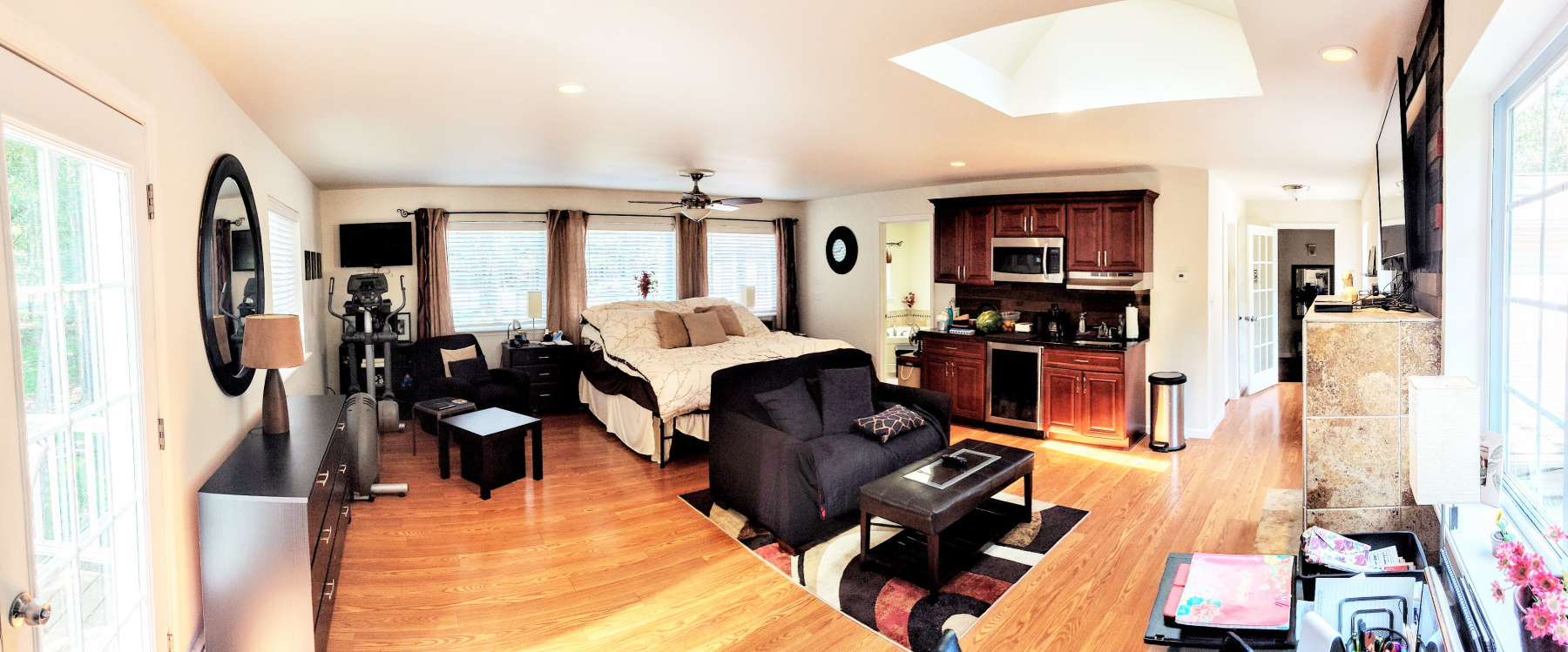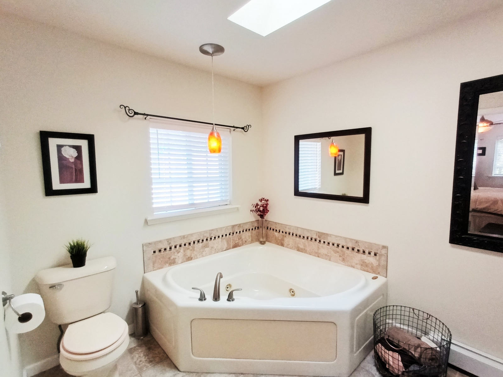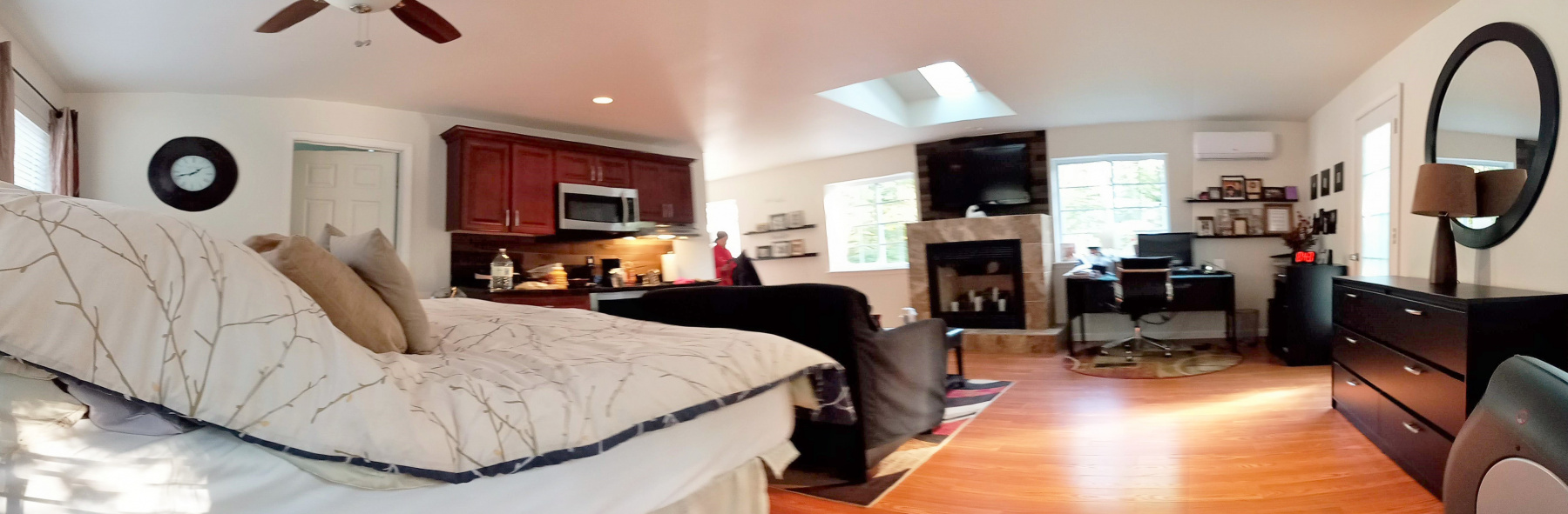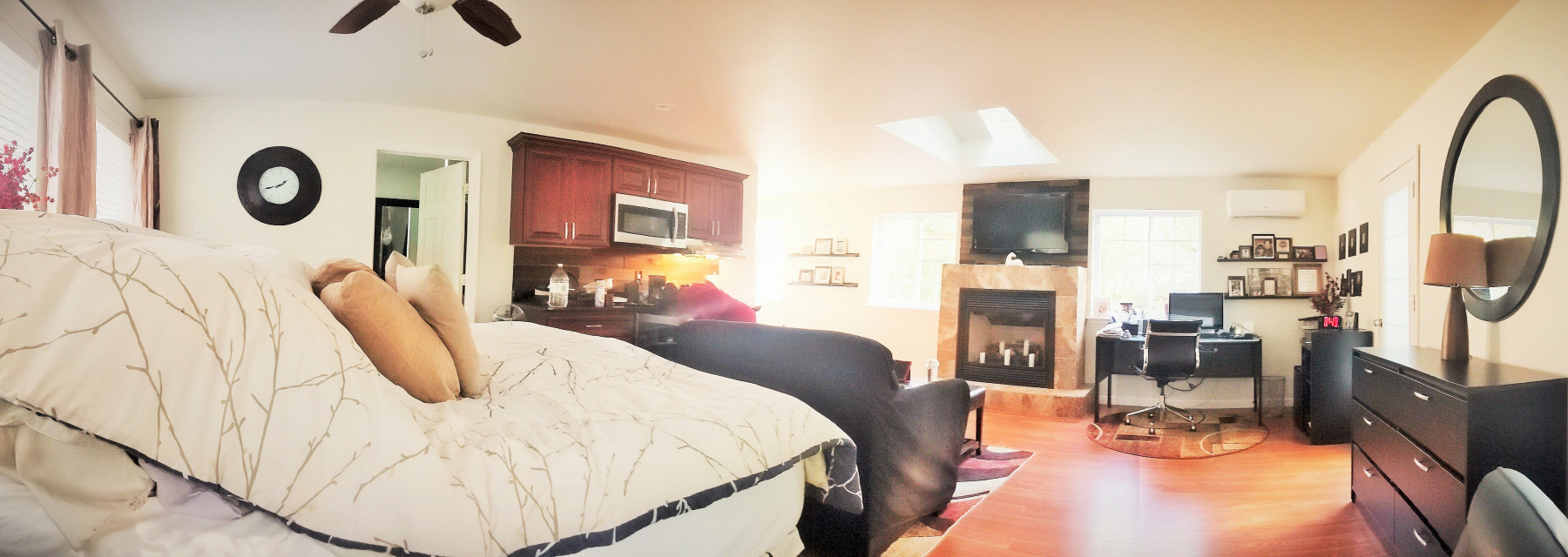 - Huge 670 sq ft master bedroom suite with fireplace, skylights, walk-in closet, private bathroom with
