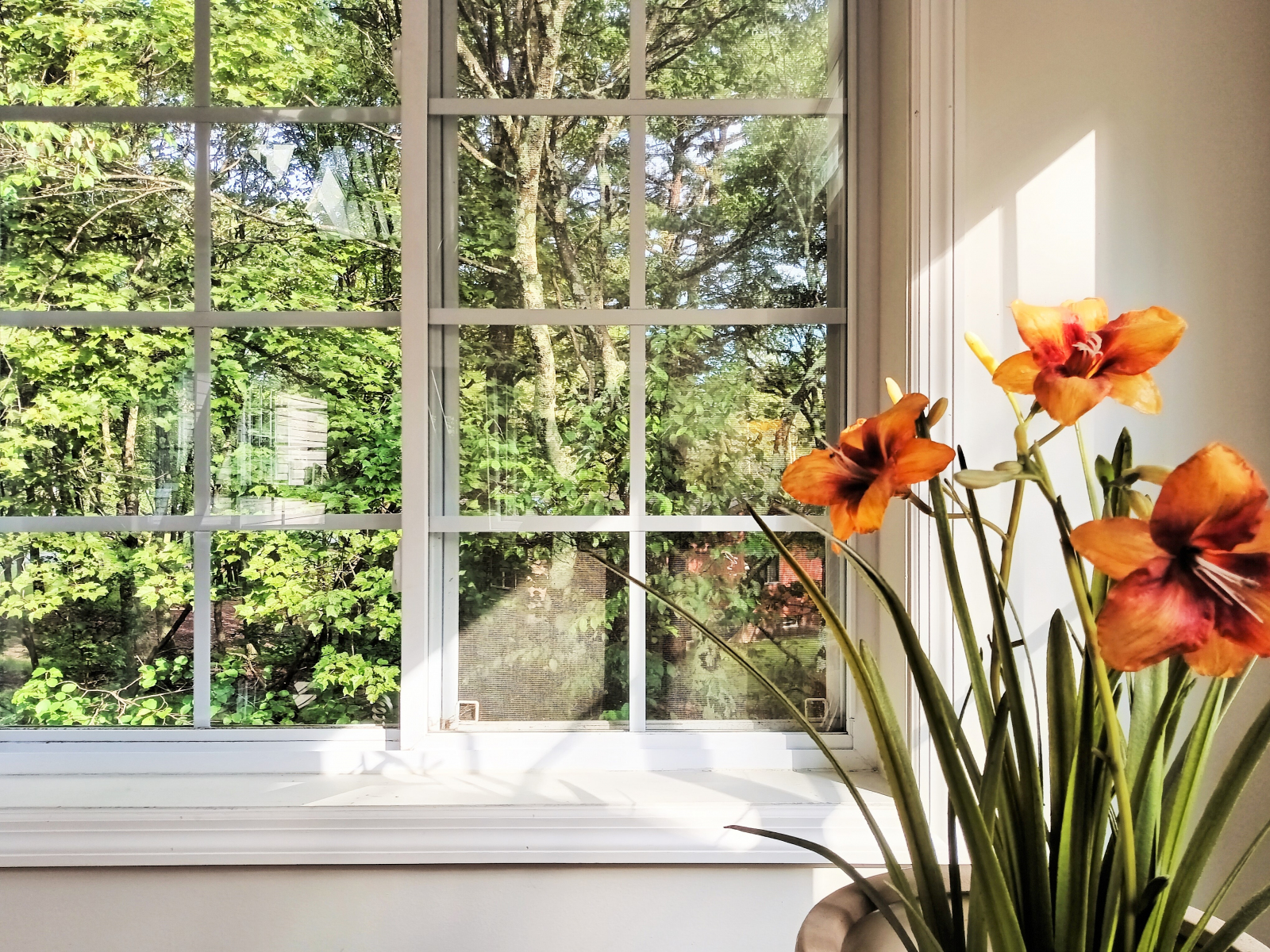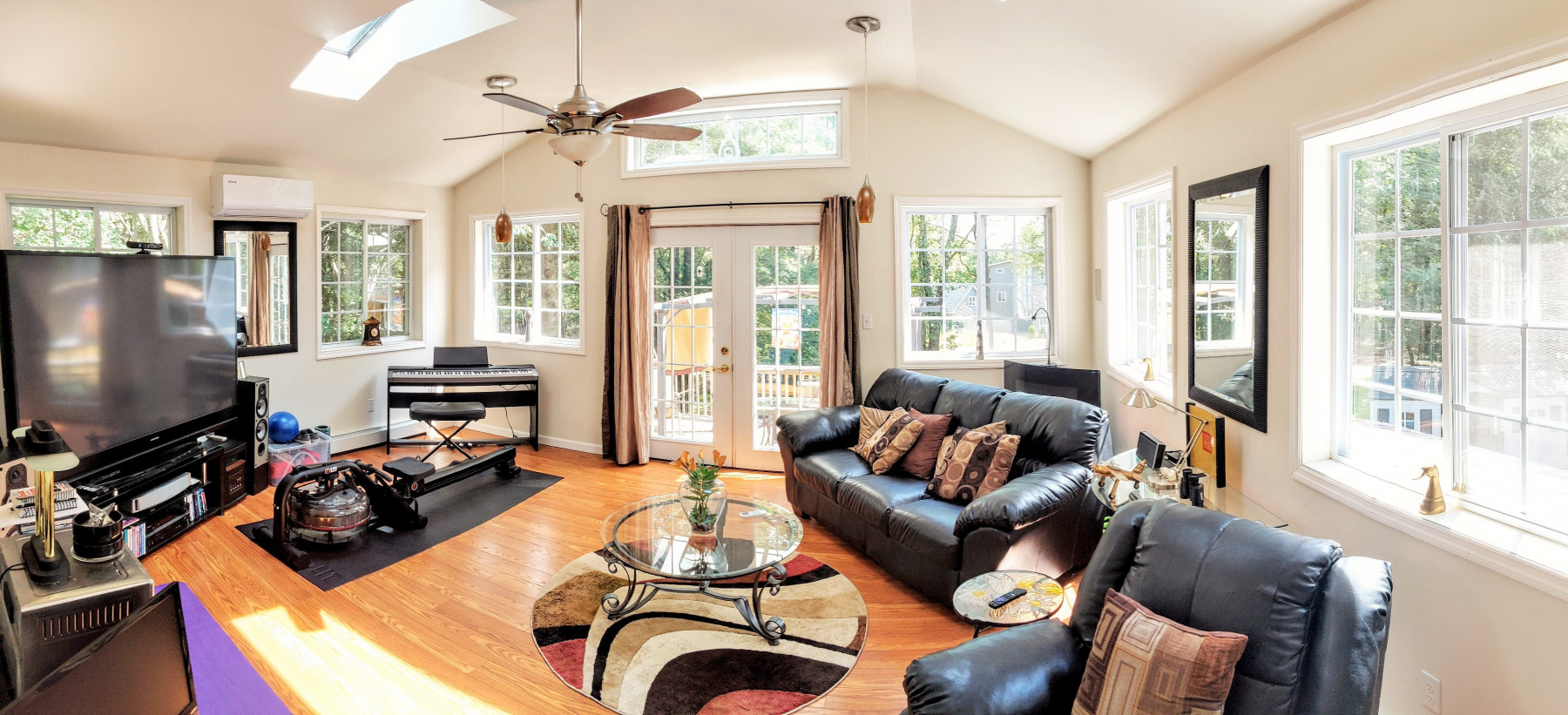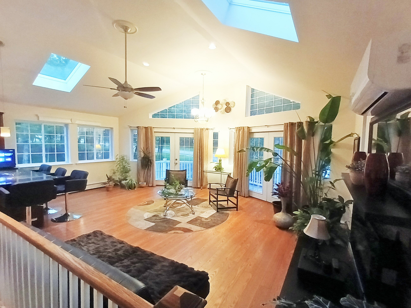 - Grand sunroom conservatory with 2 skylights and 7 large windows, French doors lead to a spacious elevated deck.