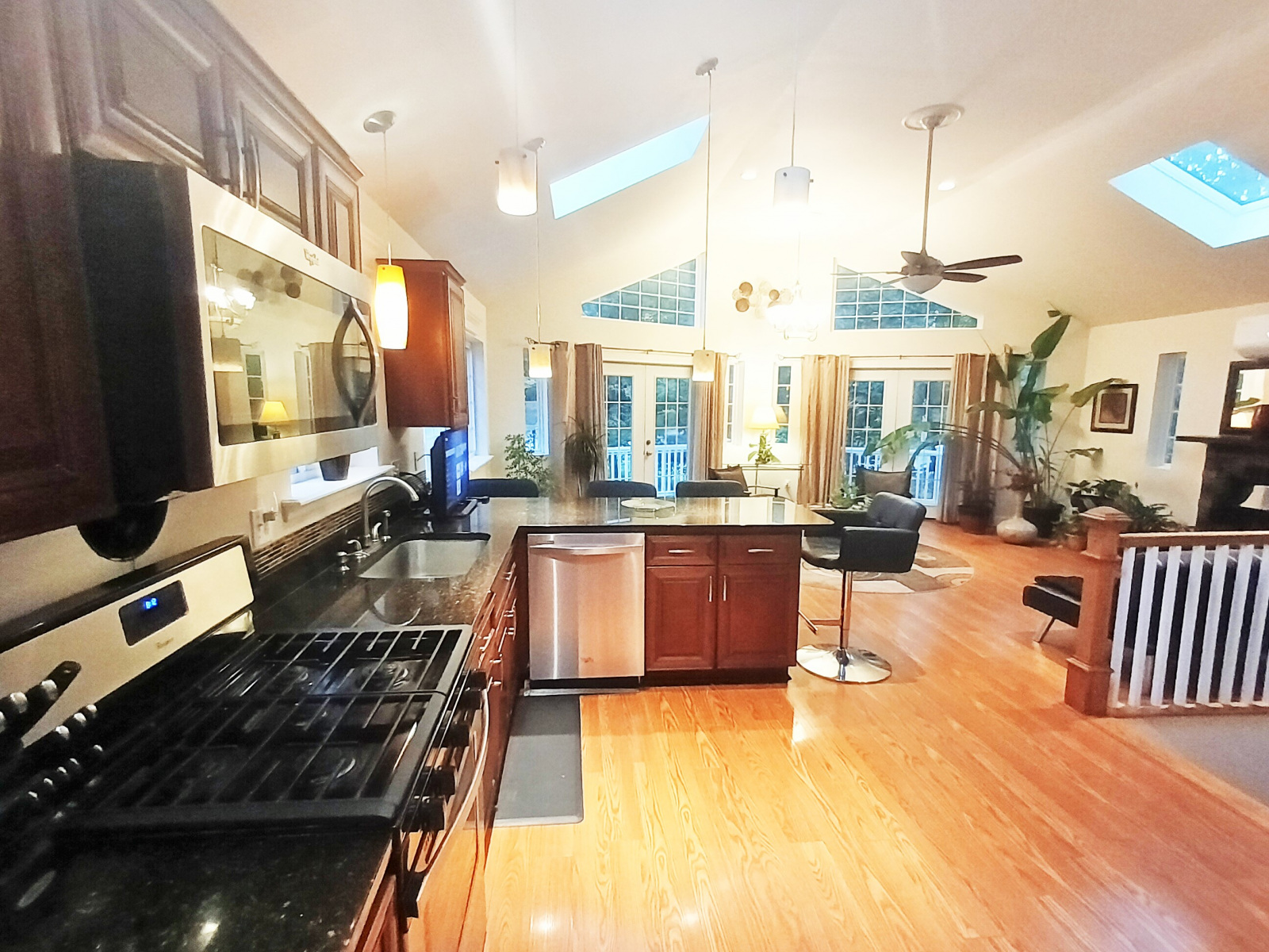 8 foot granite countertop Island, deep stainless steel sink, huge 12 foot pantry with room for all your culinary needs. - 7 large Velux skylights bathe the entire house in natural light. Watch the clouds roll by or gaze at the stars at night.