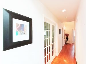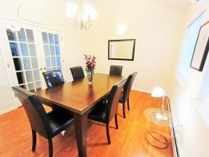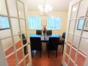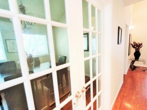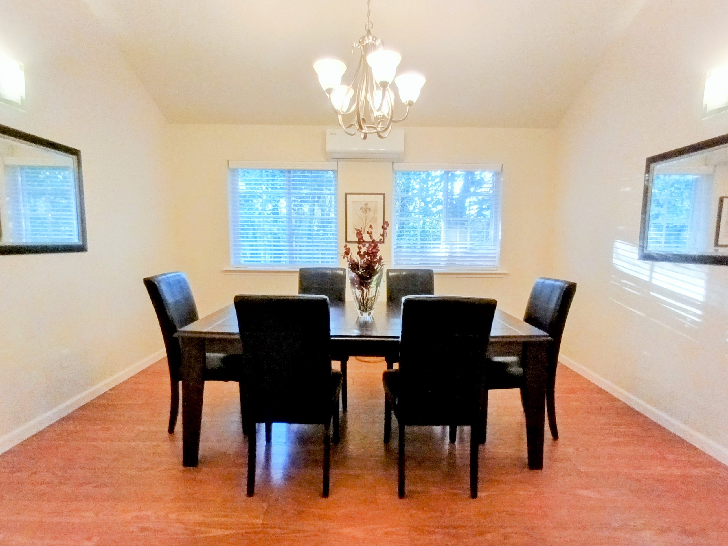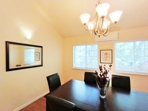 Two large 48×48 windows flood this room with bright light and provide a view of the woods in the empty lot next door. Also, the tall cathedral ceiling gives this room a spacious and roomy feel.