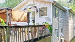 – French doors lead out to an elevated 16 x 20 foot deck.
