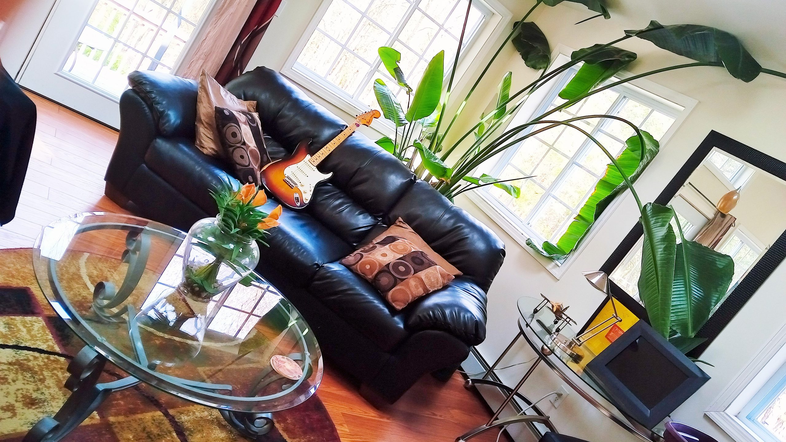 Seven 4 x 4 foot oversized windows make this room super bright while offering
